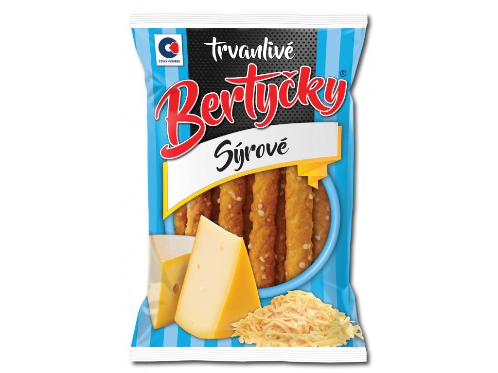 Náš originálny produkt, naša vlajková loď. Jedná sa o krehké tyčinky so soľou obsahujúcou značné množstvo poctivého syra z Česka. Syrové Bertyčky neobsahujú palmový olej, žiadne leštiace látky, konzervanty ani pridané „éčka“.Zloženie: pšeničná múka, olej repkový, voda, syr celkom 6%, z toho: tavený syr 4,3%, (mlieko, soľ, farbivo karotény, tvaroh, srvátka), soľ 3,3%, syr Eidam 1,7% (mlieko, soľ), vaječná melanž, sušený syr Ementál (mlieko, soľ), aróma, glukózový sirup.